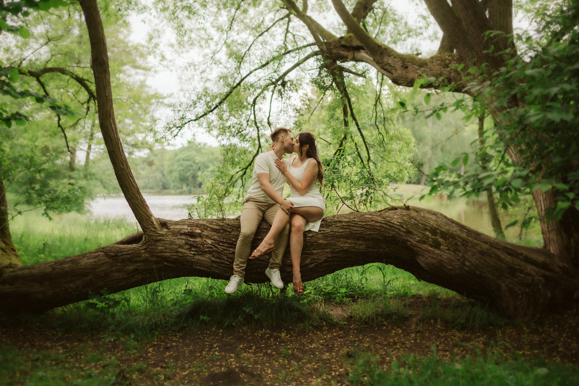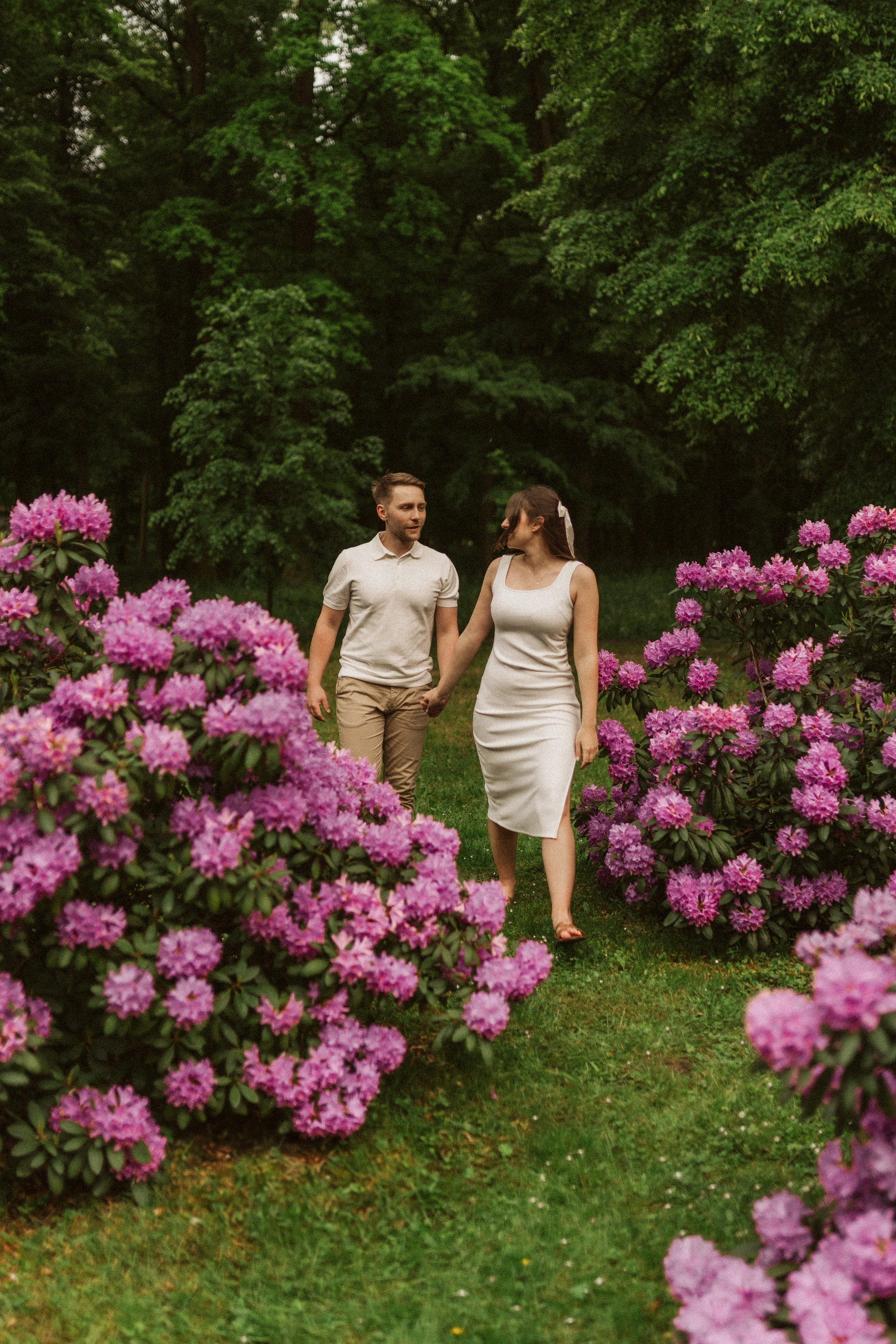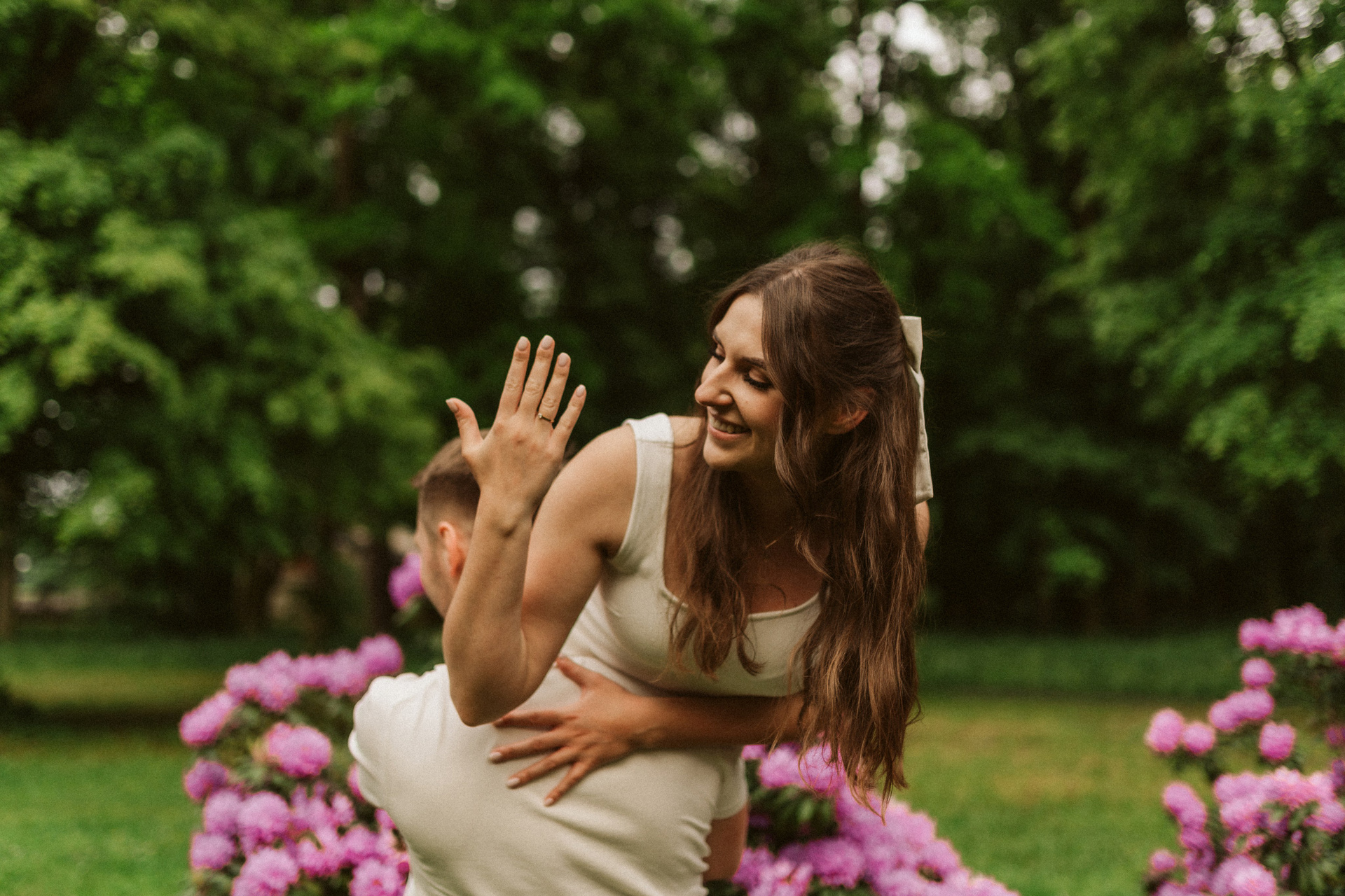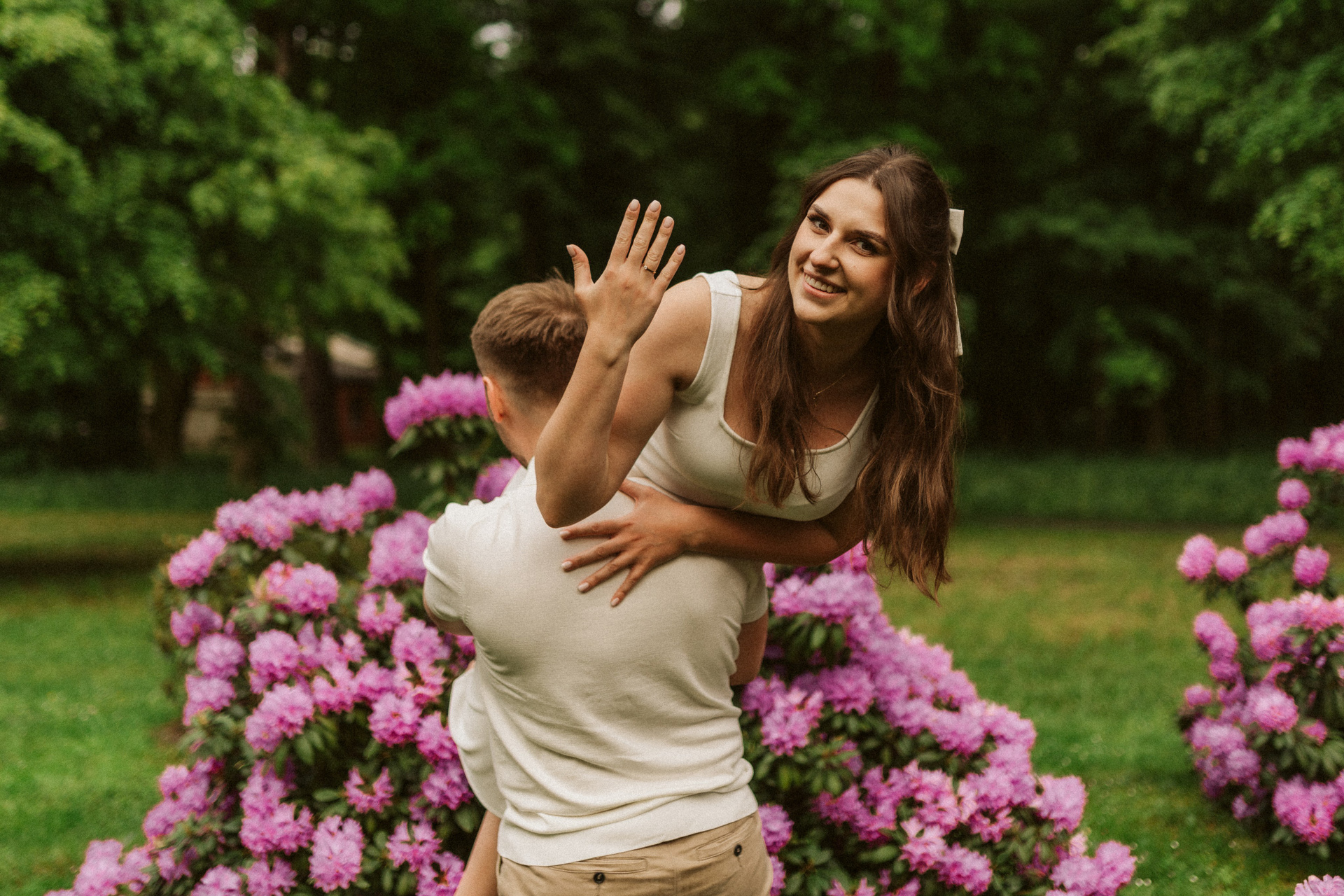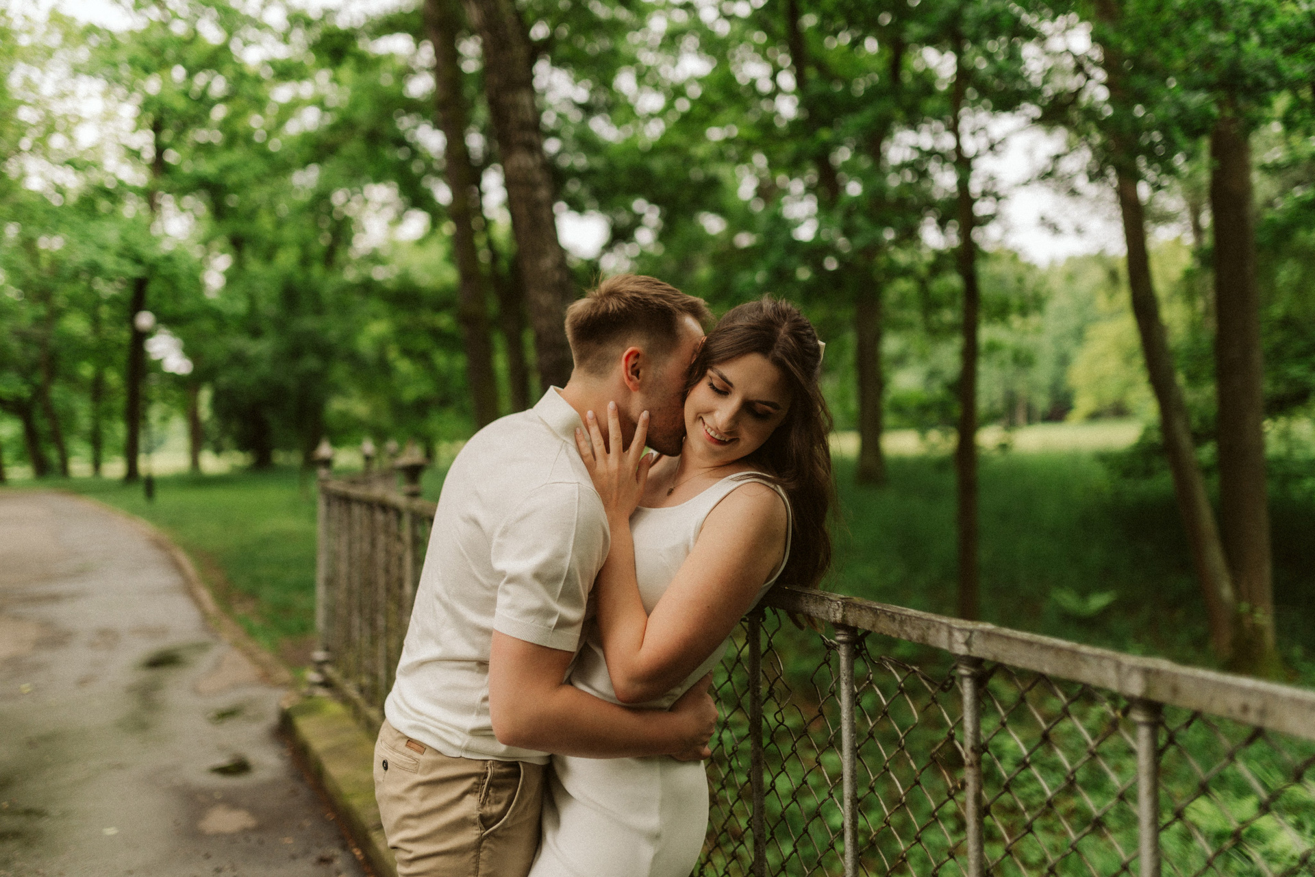 Park w Świerklańcu daje ogromną różnorodność kadrów: szerokie alejki, wysoką zieleń, naturalne polany i miejsca, w których łatwo zapomnieć o aparacie. Dzięki temu sesja narzeczeńska nie przypomina zdjęć „na pokaz”, ale prawdziwe spotkanie dwojga ludzi.